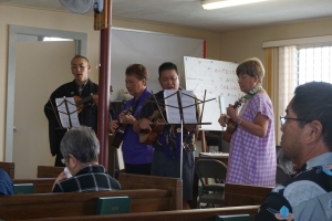 お勤めの様子です。今回は法話や仏教の歌を檀信徒様とウクレレで唱えました。とても懐かしく暖かな時間でした。
