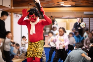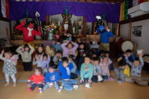 また、先月は妙見寺にて子供節分祭をおこないました。33人もの子供たちがお寺へお越しくださり大変にぎやかな節分祭を行うことができました。紙芝居や豆まきダンスを踊っている時子供たちはみんな笑顔でしたが、鬼の登場に三分の一の子供たちは大泣き。鬼も気を遣いながら泣いていない子供たちの方へ行き、頑張って立ち回ってくれておりました笑
